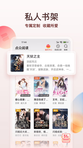 点众阅读app是一款拥有丰富小说资源的阅读类软件,各类品质小说随心畅读,覆盖各种类型的小说资源,可以免费在线免费阅读也能离线下载观看。点众阅读app可以一键将喜欢的免费小说收藏到书架上,关注作者专栏,有更新及时提醒。并且还有看过小说的浏览记录,让你随时随地继续阅读,不会忘记看过的小说。给你方便快捷的阅读体验。