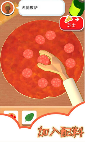 3.快来展示你的厨艺,选择材料,揉面,添加各种食材,让你的披萨更加美味。