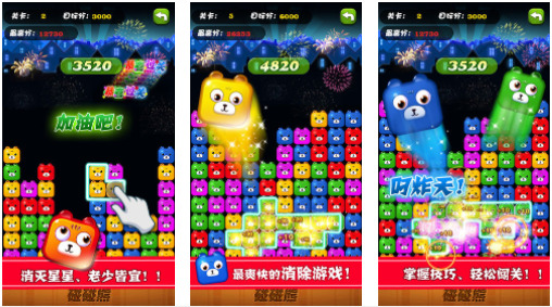 1.就像消消乐一样,两个或两个以上的熊就可以消除,单指就可操作。