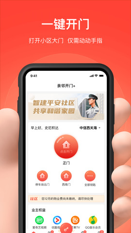 一键开启小区大门或单元门,便捷、安全、贴心,提供多样化生活服务。