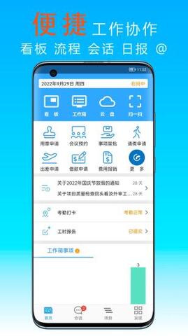 1.便捷的工作合作:提供各种有利于工作合作的工具,包括看板、对话、日报等,快速交流信息。