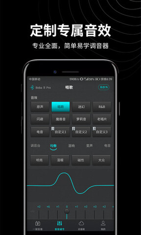 3.【音效调节】蓝牙连接、手机调节音效参数、混音开关、降噪处理、混音调节、定制调节音效保存等。