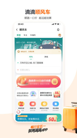 滴滴顺风车也就是滴滴出行,为大家提供顺风车出行模式~