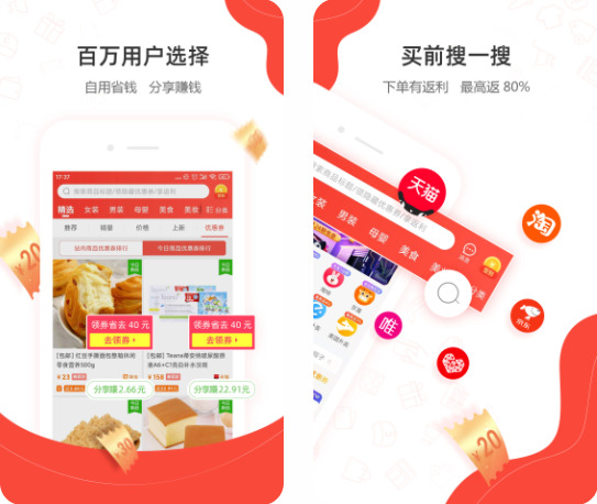 1、购物返利:支持主流网购返利,复制商品名称搜索隐藏优惠券,获得90%的购物优惠券。