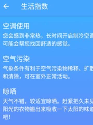 1.有多个生活指数,如穿衣指数、感冒指数等,帮助用户了解更多有关生活的天气信息。