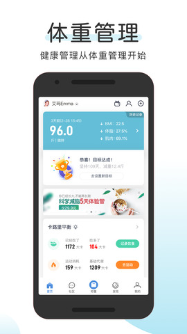 1、身体健康管理:BMI指数是通过身高体重三围计算出来的,每天的运动量、饮水量等都是根据身体数据提供的。