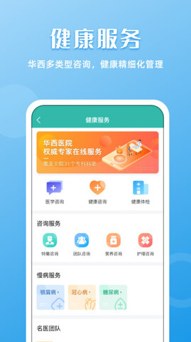 2、慢性病服务:华西团队提供定制的专科诊疗服务及长期健康管理方案。