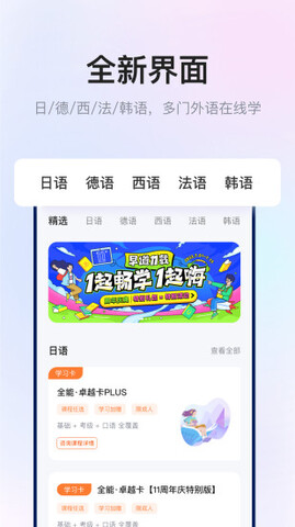 1.全新教学模式,和老师双向互动,轻松学日语、英语、法语、德语、韩语、西语等。