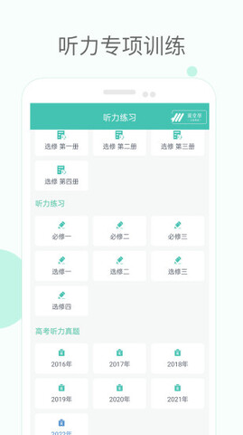 2.每个单元对应一篇听力练习,每本教材对应一套听力综合测试卷。