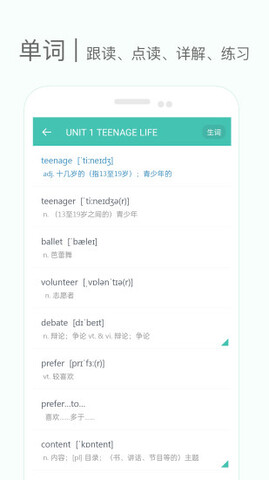 1.软件支持通过听音或者看词义,学生可以进行默写来巩固记忆。